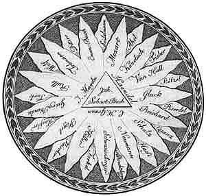 Our worthy Haydn, as is well known, found when he came to London a few years ago a not inconsiderable faction opposed to him. It was primarily Italians who attempted to stand in his way. A certain Giardini published two trios, in which Italian music is depicted with long, significant notes, while German music, on the other hand, is depicted with very short and insignificant little notes. The whole was intended as a swipe against Haydn’s music. Although the composer didn’t identify himself, choosing instead the name of a dilettante, everyone knew who it was. An English organist in the Royal German Chapel (the same one, in fact, who is now planning to publish Joh. Seb. Bach’s Well-Tempered Clavier) responded by having a sheet engraved in copper in which a sun of the German composers known to him is depicted. Joh. Seb. Bach is in the middle; immediately surrounding him are Handel, Graun and Haydn. The sun’s rays are filled with other German composers in the following manner: |